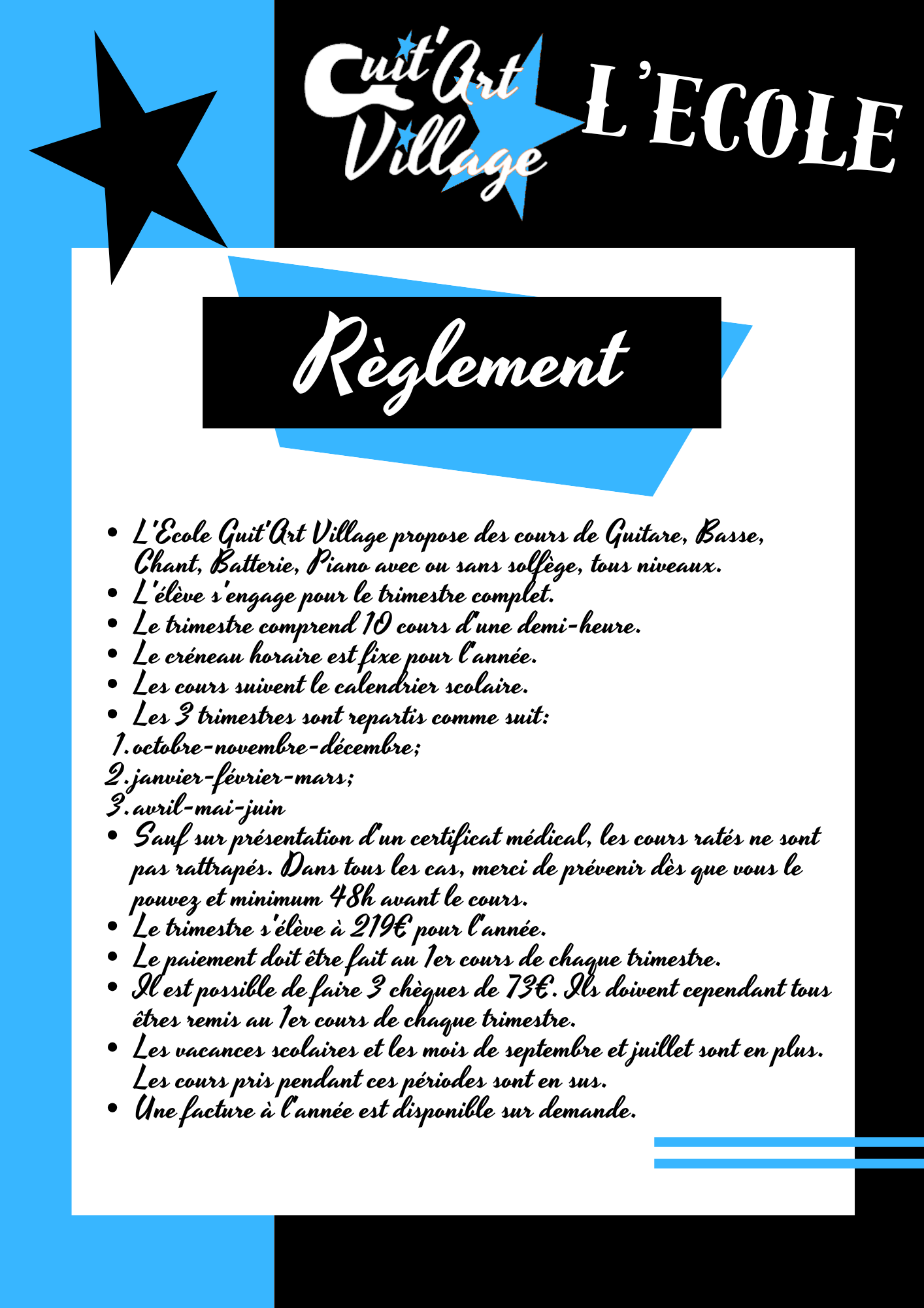 Ce mini règlement a été mis en place au fil des années pour éviter certains abus, absences répétées, retard de paiement… Néanmoins vos profs sont des gens ouverts et compréhensifs, et comme l’on dit : on peut toujours discuter ! Nous vous souhaitons beaucoup de plaisir avec votre instrument !